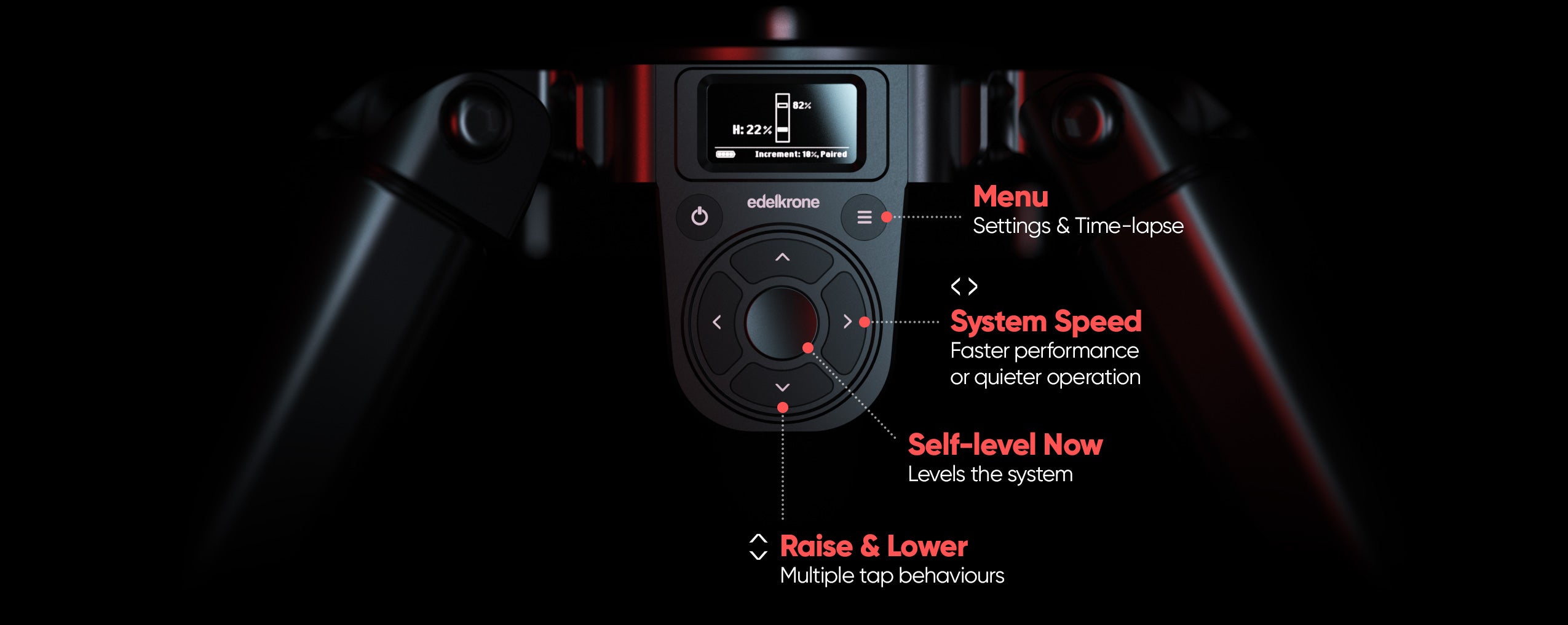 Use left and right buttons to set your speed. Use up or down buttons to move your tripod vertically. Press center to trigger an auto-leveling. From the menu button access the Motion Timelapse and many more features to come.